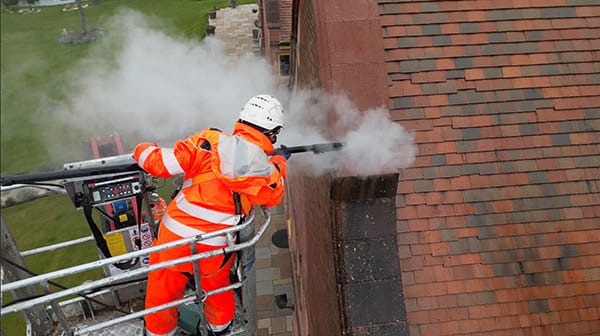 Our DOFF and low-pressure steam systems gently lift dirt, biological growth, and pollutants without saturating or damaging the substrate. This method is particularly suited to historic stone, lime mortar, and aged brickwork. No harsh chemicals, no abrasion and no risk to delicate façades.